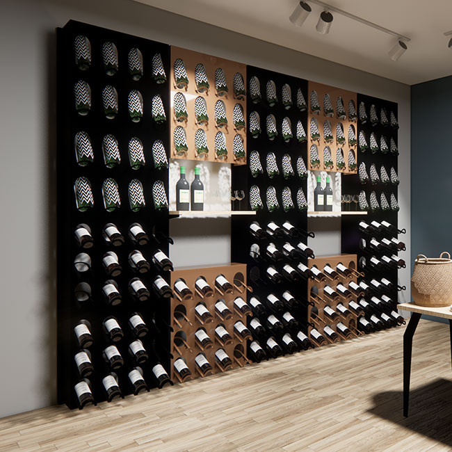 Il sistema è basato su montanti alti 240 cm cui si possono agganciare moduli espositivi porta bottiglie larghi 58 0 90 cm, e alti 60, 90 o 120 cm.