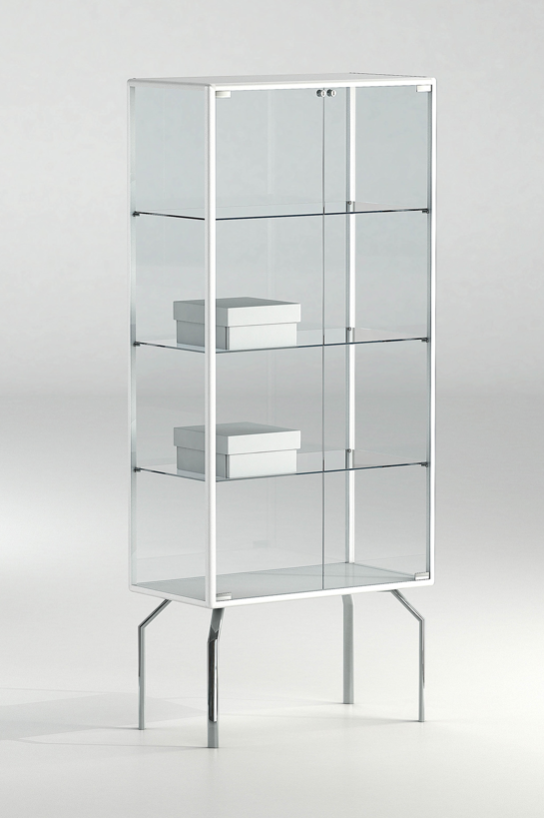 Anta in vetro temperato con serratura, telaio in alluminio verniciato bianco.